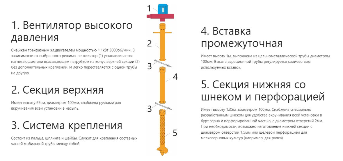 Нижнюю секцию (шнек) ,с помощью патрубка верхнего с ручками, вкручиваем в насыпь, до уровня шплинтового соединения, снимаем патрубок с ручкой, соединяем шнек со вставкой (1м) и снова ставим патрубок верхний с ручками, уже на вставку метровую. Таким образом, добавляя вставки 1м, можно наращивать длину трубы до 6м. Трубы вкручиваются в бурт вертикально или под небольшим наклоном. Устанавливаем вентилятор аэратора в нужном режиме (нагнетания или всасывания). По окончании процесса снимаем вентилятор, выкручиваем